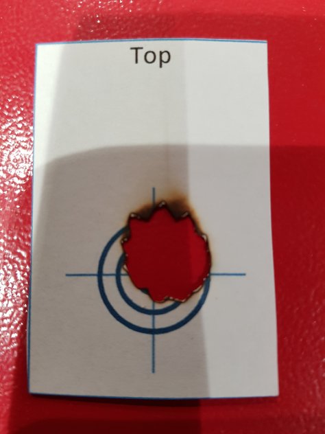 Undeterred I moved my target to the first mirror 2 inches from the tube end. I also placed some board to catch the stray beam and thought to myself, yep, all bases covered, ready to press ‘pulse’ again….. so I did. This time my paper target burst into flames! Damn, should have seen that coming. After blowing out the smouldering flames I then found out that the mount had gone rather soft in the middle, to be expected I guess. A couple more goes and I had it sussed a bit later. These pics are the latter goes, the first one is ash.